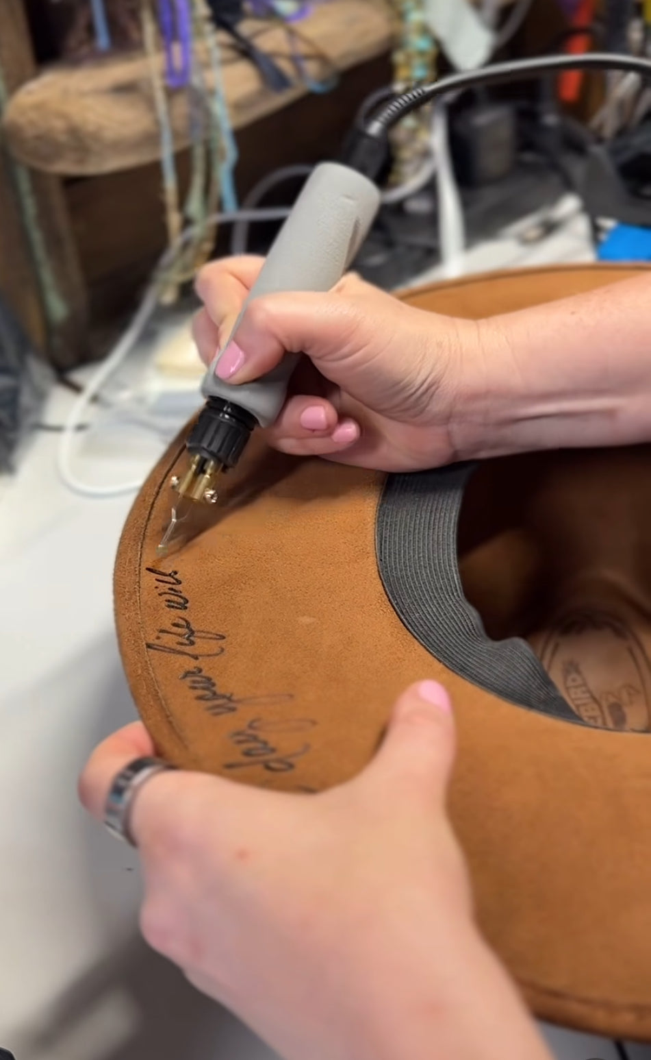 At Burned to Brave, we use a leather burning gun to make every hat truly one-of-a-kind. From personal quotes to song lyrics to words close to your heart. We can burn your story right into your hat.