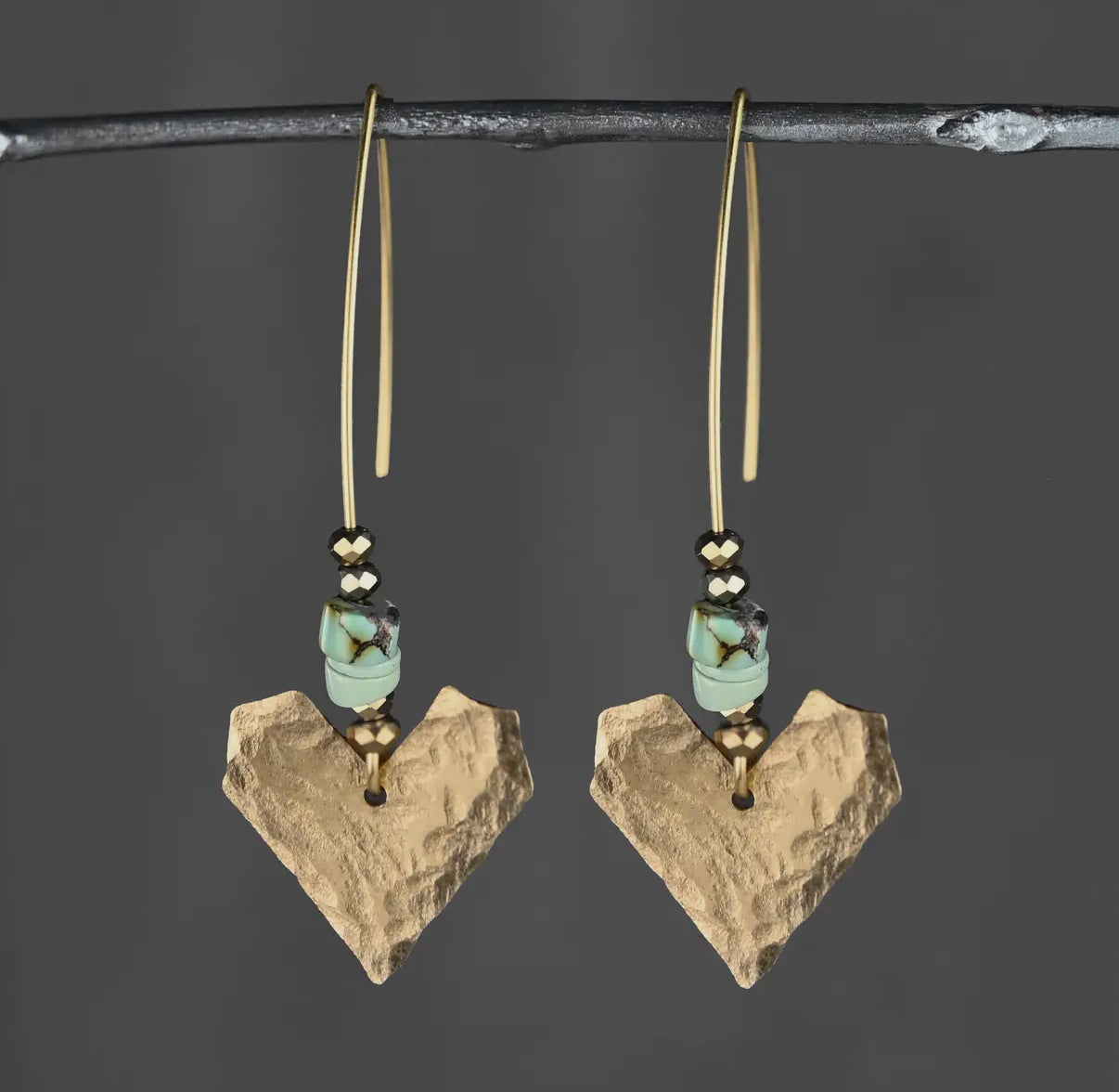 Hammered Brass Heart w/ Long Wire & Turquoise Jasper Earring