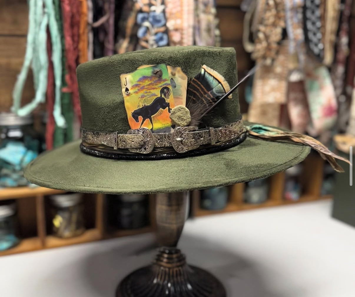 Tucked in are a turkey feather, quill, & a burned Jack of Spades card, the stallion charging through a painted sunset sky... a nod to luck, courage, & wild abandon. Every detail from the tumbled river rock, the rhinestone shine, hand-dyed silks, the leather accents to the soft, time-worn texture is crafted to feel like adventure Itself.