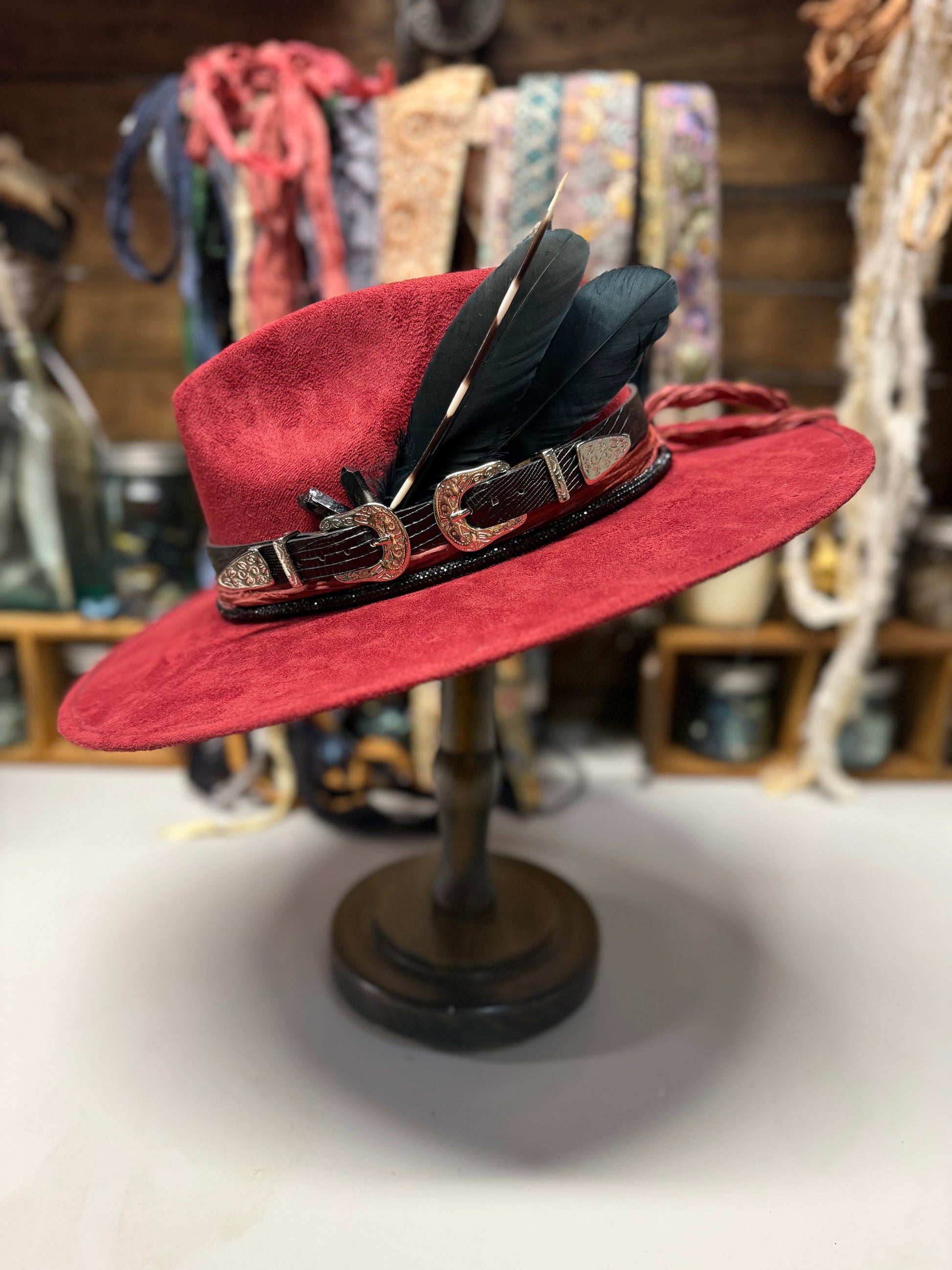 This burgundy fedora is a masterpiece of detail and design. Wrapped in a black rhinestone rope band, layered with silks, adorned with raven feathers, black stones, and a rare porcupine quill. Finished with a bold black leather double-buckle belt. This hat speaks power, elegance, and individuality.